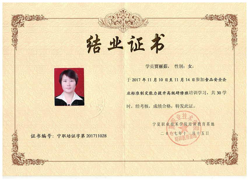賈麗茹同志食品安全企業標準制定能力提升高級研修班結業證書